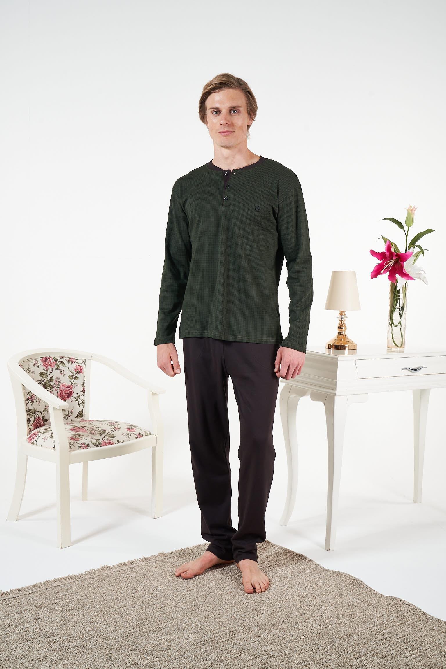 Doğal haki tonuyla sade ve modern bir görünüm sunar. Üst kısmındaki düğmeli yaka detayıyla klasik bir dokunuş kazanan bu takım, düz renk alt parçasıyla sade şıklığı bir araya getirir. Hafif ve esnek penye kumaşı sayesinde uyku ve dinlenme saatlerinde maksimum rahatlık sağlar.